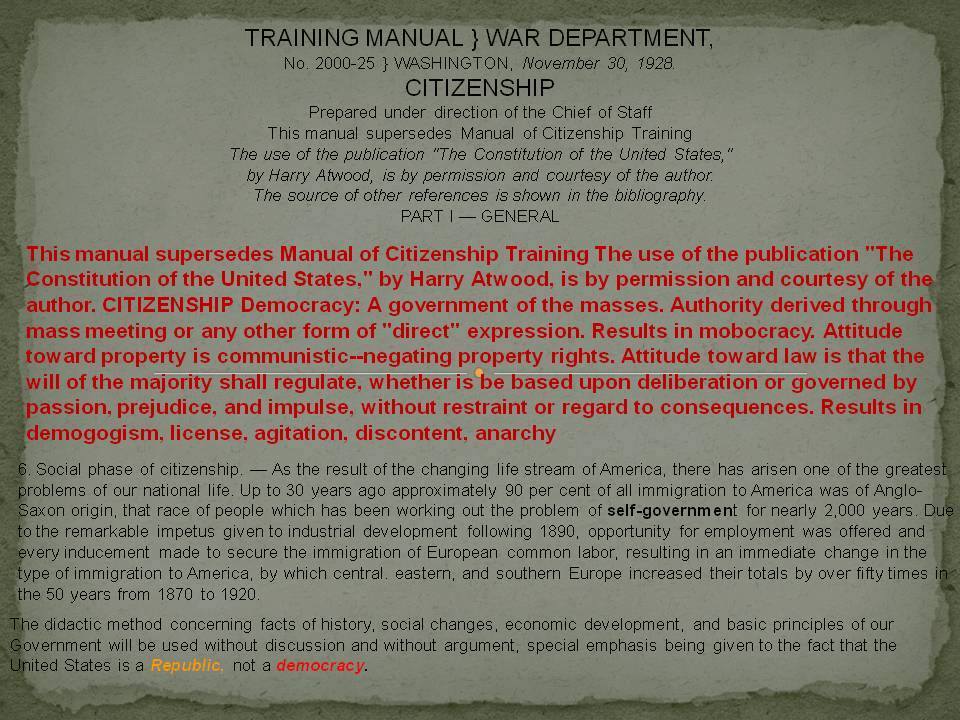 In 1929 due to massive immigration War Department DOD published training manual on immigration. DOD details dangers of massive immigration and details recommendations for solution for America’s sovereignty.