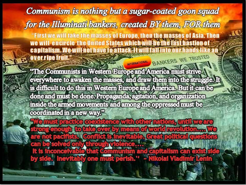 “”First we will take Eastern Europe, then the masses of Asia. We will encircle the last bastion of capitalism, the United States of America. We will not need to fight. It will fall as a ripe fruit into our hands.” And, “We must practice coexistence with other nations, until we are strong enough to take over by means of world revolution…. We are not pacifists. Conflict is inevitable. Great political questions can be solved only through violence…. It is inconceivable that Communism and capitalism can exist side by side. Inevitably one must perish.” Nikolia Vladimir Lenin