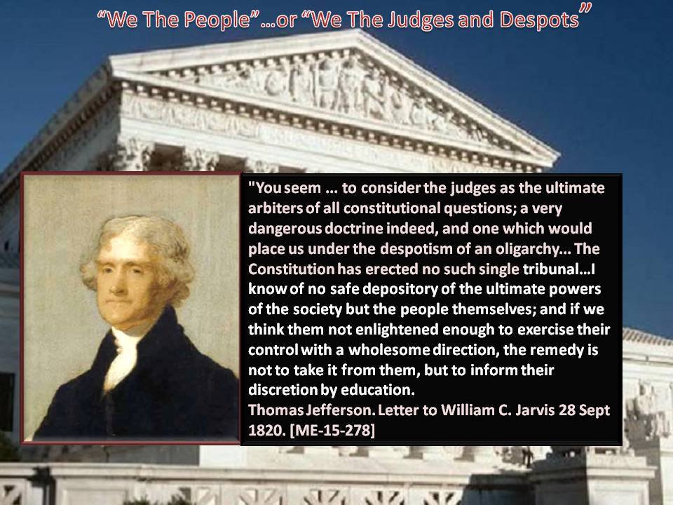 “To consider the judges as the ultimate arbiters of all constitutional questions [is] a very dangerous doctrine indeed, and one which would place us under the despotism of an oligarchy. Our judges are as honest as other men and not more so. They have with others the same passions for party, for power, and the privilege of their corps. Their maxim is boni judicis est ampliare jurisdictionem [good justice is broad jurisdiction], and their power the more dangerous as they are in office for life and not responsible, as the other functionaries are, to the elective control. The Constitution has erected no such single tribunal, knowing that to whatever hands confided, with the corruptions of time and party, its members would become despots. It has more wisely made all the departments co-equal and co-sovereign within themselves.” –Thomas Jefferson to William C. Jarvis, 1820. ME 15:277