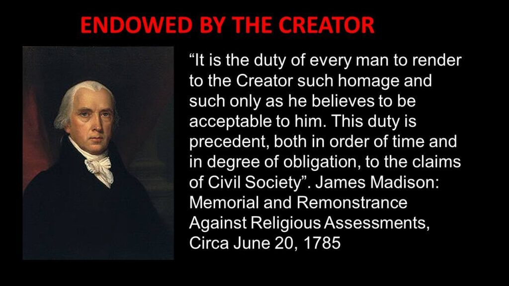 “Because we hold it for a fundamental and undeniable truth, “that religion or the duty which we owe to our Creator and the manner of discharging it, can be directed only by reason and conviction, not by force or violence.” The Religion then of every man must be left to the conviction and conscience of every man; and it is the right of every man to exercise it as these may dictate. This right is in its nature an unalienable right. It is unalienable, because the opinions of men, depending only on the evidence contemplated by their own minds cannot follow the dictates of other men: It is unalienable also, because what is here a right towards men, is a duty towards the Creator. It is the duty of every man to render to the Creator such homage and such only as he believes to be acceptable to him. This duty is precedent, both in order of time and in degree of obligation, to the claims of Civil Society. Before any man can be considered as a member of Civil Society, he must be considered as a subject of the Governour of the Universe: And if a member of Civil Society, do it with a saving of his allegiance to the Universal Sovereign. We maintain therefore that in matters of Religion, no man’s right is abridged by the institution of Civil Society and that Religion is wholly exempt from its cognizance. True it is, that no other rule exists, by which any question which may divide a Society, can be ultimately determined, but the will of the majority; but it is also true that the majority may trespass on the rights of the minority.” – James Madison Memorial and Remonstrance Against Religious Assessments, 1785